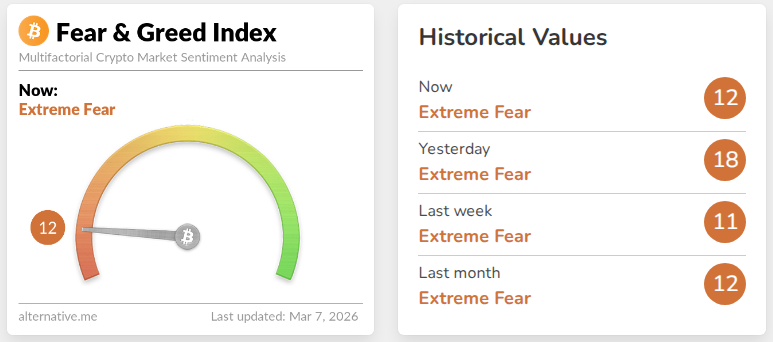 Bitcoin’s slide pushed the Crypto Fear & Greed Index down six points to a score of 12 on Saturday, placing it deep in “Extreme Fear” territory. The index measures market sentiment across a range of factors including volatility, trading volume, and social media activity.