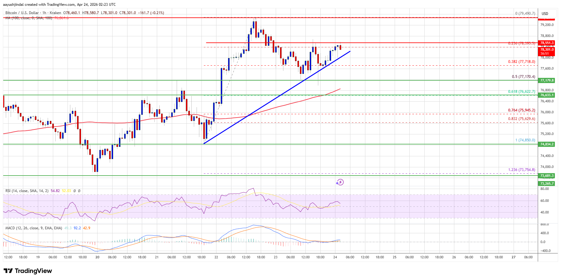 Bitcoin price started a fresh increase and cleared the $78,000 zone. BTC is consolidating and might aim for more gains above the $78,550 level.